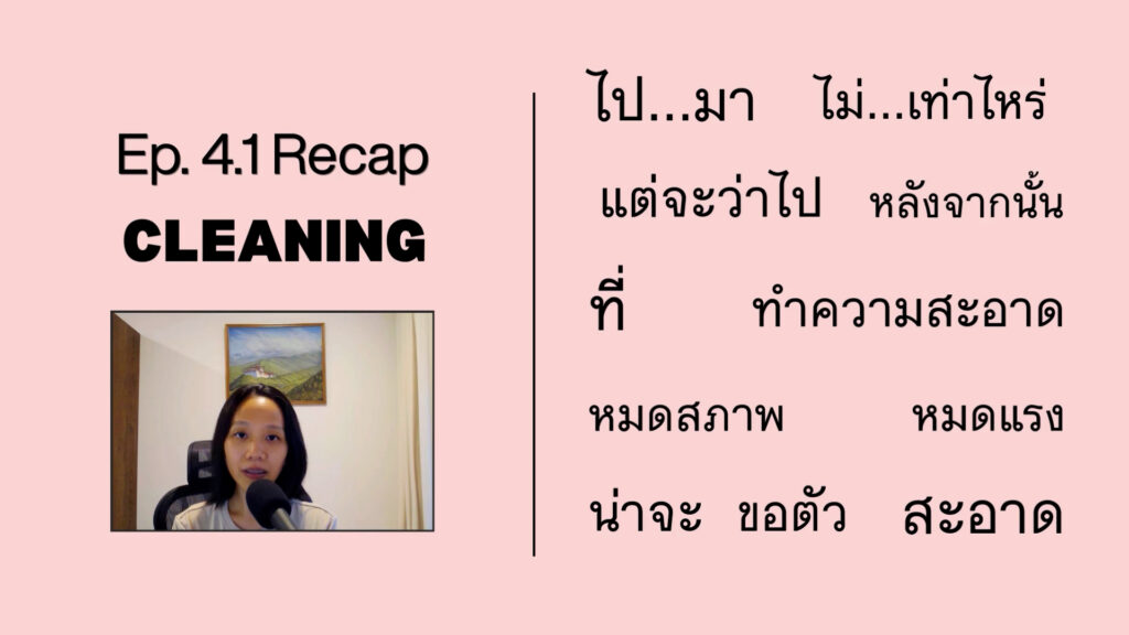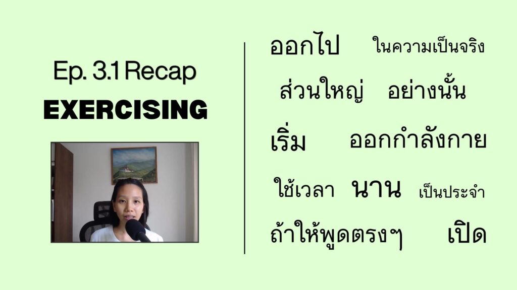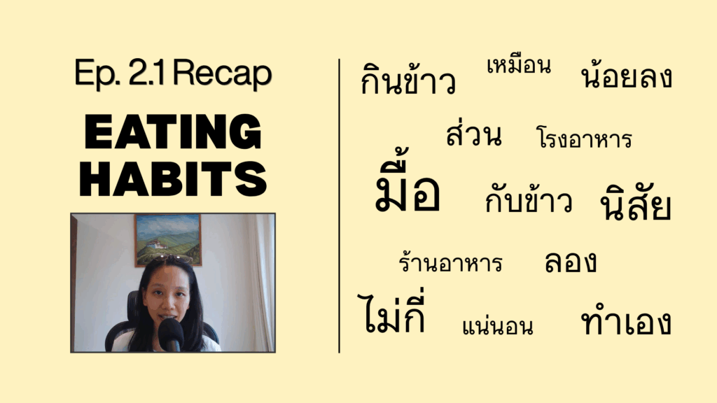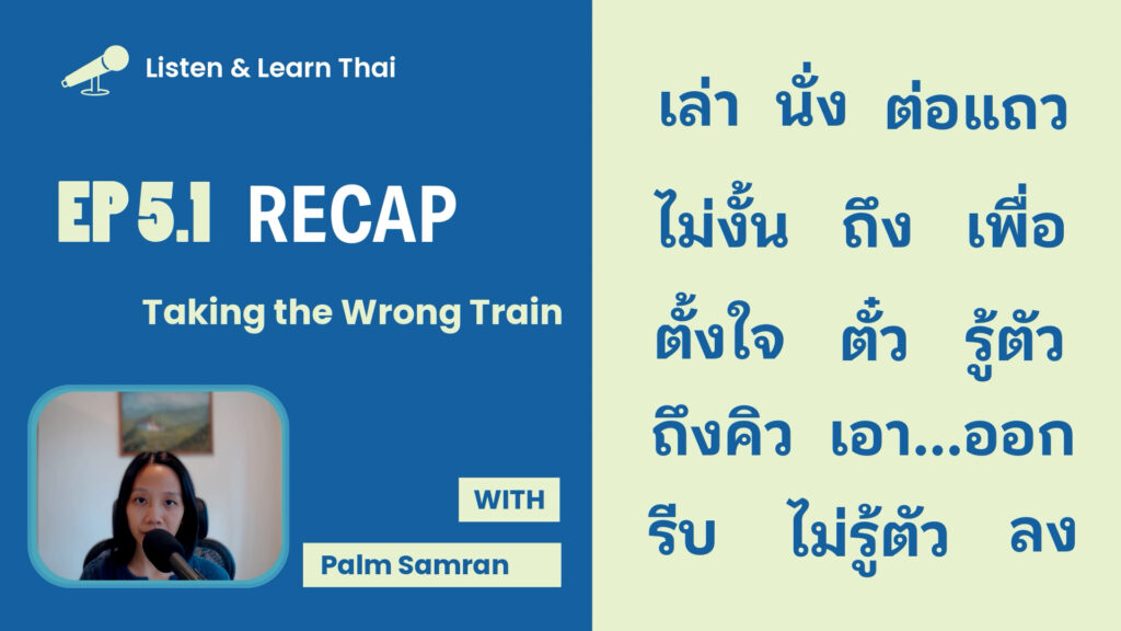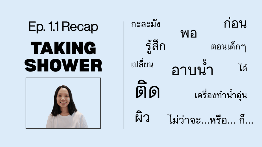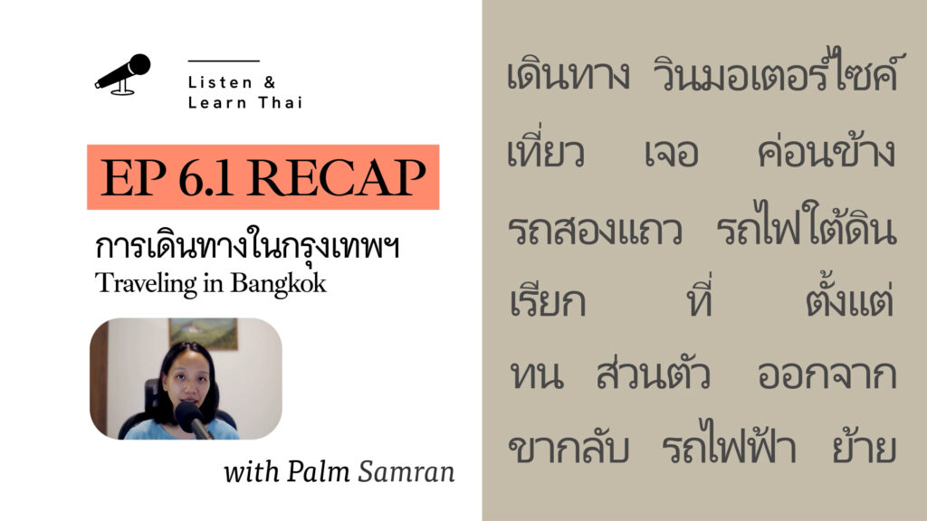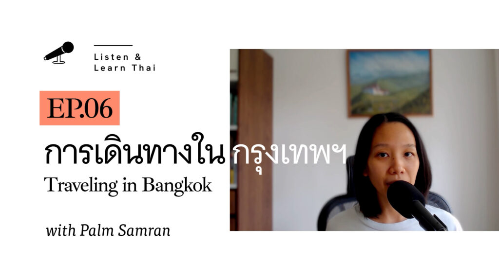#00 Introduction to Listen & Learn Thai (ฟังไป เรียนไป) Podcast. May 8, 2025 #01 การอาบน้ำ (Taking Shower) – I talk about why I’m trying to take a cold shower. May 9, 2025 #01.1 RECAP – การอาบน้ำ (Taking Shower) – Review and reinforce key words & phrases. May 27, 2025 #02 นิสัยการกิน (Eating Habit) – My eating habit when I was a kid compared to now. June 9, 2025 #02.1 RECAP – นิสัยการกิน (Eating Habit) – Review and reinforce key words & phrases. June 25, 2025 #03 การออกกำลังกาย (Exercising) – I discussed my exercise routine. July 9, 2025 #03.1 RECAP – การออกกำลังกาย (Exercising) – Review and reinforce key words & phrases. July 25, 2025 #04 การทำความสะอาด (Cleaning) – Cleaning is not my favorite thing to do. How about you? August 9, 2025 #04.1 RECAP – การทำความสะอาด (Cleaning) – Review and reinforce key words & phrases. August 25, 2025 #05 นั่งรถไฟผิดขบวน (Taking the Wrong Train) – I discussed my experience taking the Wrong Train in Bangkok. September 9, 2025 #05.1 RECAP นั่งรถไฟผิดขบวน (Taking the Wrong Train) – Review and reinforce key words & phrases September 25, 2025 #06 การเดินทางในกรุงเทพฯ (Traveling in Bangkok) – I talked about how I travel in Bangkok by public transportation. October 9, 2025 #06.1 RECAP การเดินทางในกรุงเทพฯ (Traveling in Bangkok) – I talked about how I travel in Bangkok by public transportation. October 25, 2025