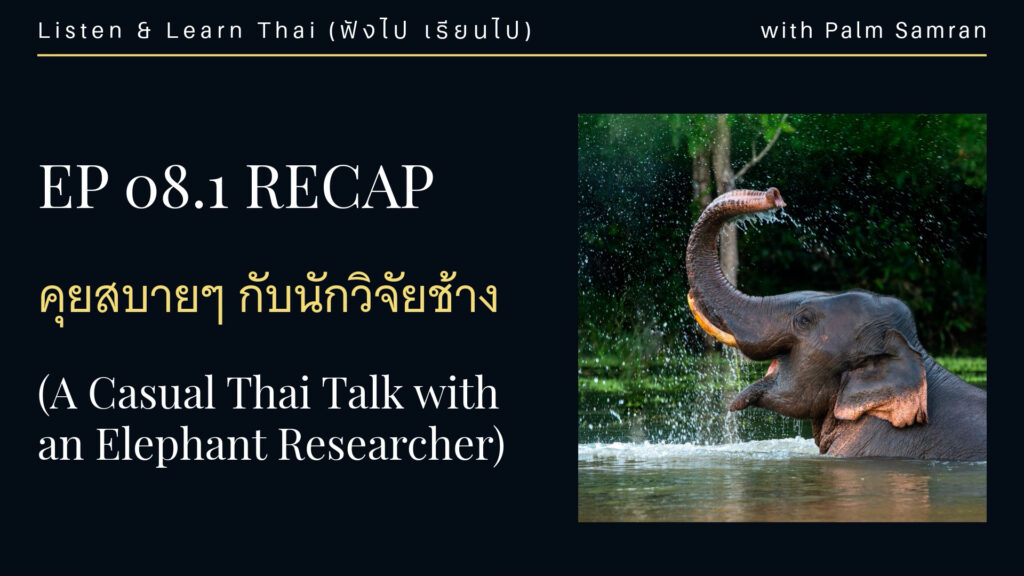 #00 Introduction to Listen & Learn Thai (ฟังไป เรียนไป) Podcast. May 8, 2025 #01 การอาบน้ำ (Taking Shower) – I talk about why I’m trying to take a cold shower. May 9, 2025 #01.1 RECAP – การอาบน้ำ (Taking Shower) – Review and reinforce key words & phrases. May 27, 2025 #02 นิสัยการกิน (Eating Habit) – My eating habit when I was a kid compared to now. June 9, 2025 #02.1 RECAP – นิสัยการกิน (Eating Habit) – Review and reinforce key words & phrases. June 25, 2025 #03 การออกกำลังกาย (Exercising) – I discussed my exercise routine. July 9, 2025 #03.1 RECAP – การออกกำลังกาย (Exercising) – Review and reinforce key words & phrases. July 25, 2025 #04 การทำความสะอาด (Cleaning) – Cleaning is not my favorite thing to do. How about you? August 9, 2025 #04.1 RECAP – การทำความสะอาด (Cleaning) – Review and reinforce key words & phrases. August 25, 2025 #05 นั่งรถไฟผิดขบวน (Taking the Wrong Train) – I discussed my experience taking the Wrong Train in Bangkok. September 9, 2025 #05.1 RECAP นั่งรถไฟผิดขบวน (Taking the Wrong Train) – Review and reinforce key words & phrases September 25, 2025 #06 การเดินทางในกรุงเทพฯ (Traveling in Bangkok) – I talked about how I travel in Bangkok by public transportation. October 9, 2025 #06.1 RECAP การเดินทางในกรุงเทพฯ (Traveling in Bangkok) – Review and reinforce interesting vocabulary. October 25, 2025 #07 ฤดู (Seasons) – The weather has recently been nice. So, I talked about the seasons in Thailand. November 9, 2025 #07.1 RECAP ฤดู (Seasons) – Review and reinforce essential words and phrases about seasons. November 25, 2025 #08 – A Casual Thai Talk with an Elephant Researcher – our special guest, khun Sydney Hope. January 9, 2025 #08.1 A Casual Thai Talk with an Elephant Researcher – Review interesting words and phrases. January 25, 2025 #09 – ปัญหา (Problems) – In this episode, I talked about problems in general. Let’s see if you understand it. February 9, 2025 #09.1 – RECAP ปัญหา (Problems) -Review and reinforce essential words and phrases about seasons. February 25, 2025 #10 การจัดการความเครียด (Stress Management) – I discussed how I deal with my stress 🙂 March 12, 2025